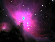 Jetzt leuchtete der Nebel in intensivem Blaugrün und zeigte deutlich andere Formationen. Inmitten in diesem blaugrünen Licht fanden sich einige - durch das Filter - rotviolett eingefärbte Sterne.