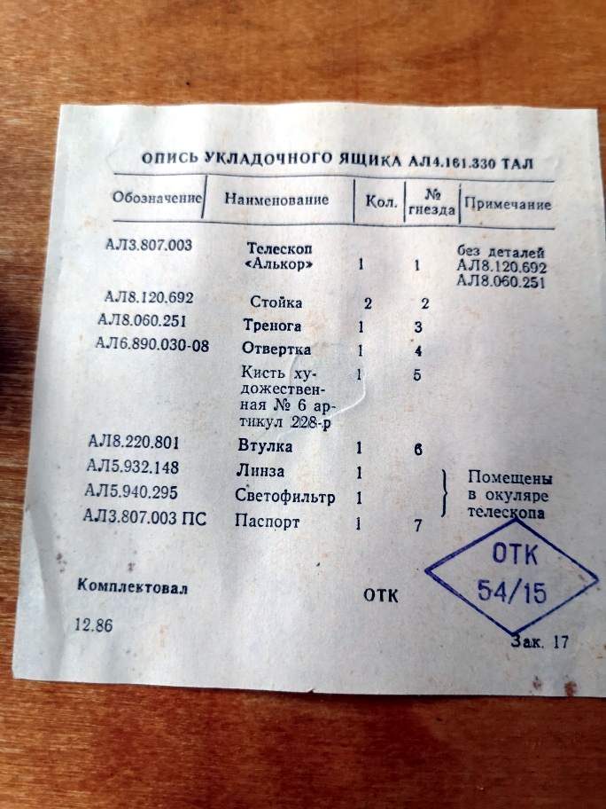 Ja, da stand dann also im Treppenaufgang ein gut verpacktes - gar nicht mal sooo großes Paket. Neugierde groß, schnell hoch und ausgepackt. Wunderbar, alleine schon diese Holzkiste. Geöffnet und ... alles drin. Schön. Aaaaber ... es deutete sich sofort eine fulminante Reinigungssession an: Alles verstaub- schmockt, Rost und diese komische "Watte" auf dem Holz zum Lagern/Polstern der Teile: die hat sich aufgelöst und in eine klebrige Masse verformt, die überall "anpappte". Also ... gab was zu tun. Zunächst aber erstmal: Zusammenbauen. Ging auch schnell, die beiden Säulensegmente in den Fuß geschraubt, darauf dann die azimutale Montierung mitsamt dem Tubus. Fertig. Nun konnte man auch im aufgebauten Zustand den Zustand ermessen: Schmutz, Schmier und Rost allenthalben. Muss wirklich eine feuchte und muffige Umgebung (... auf Nachfrage: "... stand lange in einem Schuppen ...". Ja, das muss wohl seeeehr lange gewesen sein. Es stellte sich zumindest heraus, das der kleine Tal noch aus Zeiten der Sowjetunion stammte; steht doch auf dem in der Kiste eingeklebten Zettel etwas von "12/86". Also noch ein - mittlerweile 36 Jahre alter - UdSSR-Tal). Auch am 15er Ramsden-Zweilinser-Okular Rost und Schmutz auf den Linsen. Die Barlow und die Verlängerungshülse, okay. Überraschend ein beigelegter Okular-Sonnenfilter mit schönem blauweisslichem Bild. Was ist denn nun mit dabei?