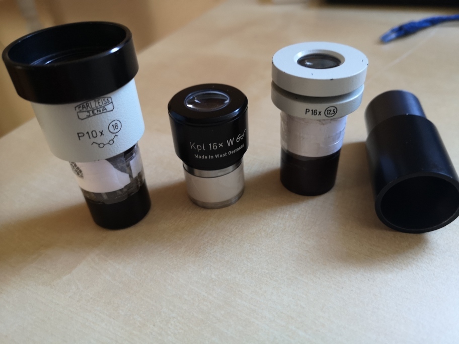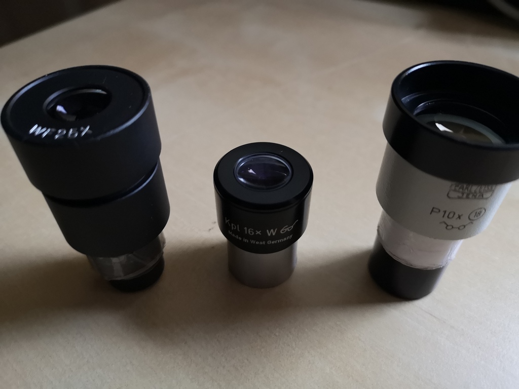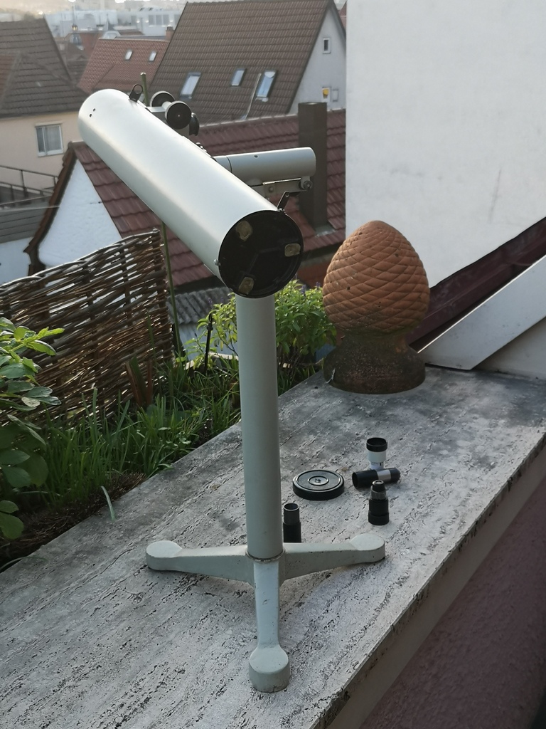 Also, nach ausgiebiger Reinigungs und einer kleinen FS-"Justage" (das Blech, an dem der FS befestigt ist, musste ein klein Wenig in die richtige Richtung gebogen werden, so daß der HS nun komplett im FS erkennbar war) gab es doch tatsächlich einige Wolkenlücken: also gleich mal raus den Lütten auf den Balkon. Echt pfiffig: die Säule besteht aus zwei zusammenschraubbaren Segmenten; eines dann raus - und fertig ist das Tisch- bzw. Balkonteleskop. Zunächst musste ich mich mal an den Peilsucher gewöhnen (sofort der Gedanke: wie bekommt man - ohne rumzubohren - einen kleinen 6x30er Sucher montiert; mal sehen ...). Naja. Also los: der zenitnahe ε Lyrae natürlich: nach einiger Herumgurkerei hatte ich ihn dann im ca. 33fach vergrößernden 15er Okular: gleich wurde klar: Das Okular taugt nicht viel. Ist halt ein einfaches Ramsden mit mindestens noch einer siffigen Linse. Und dann noch dieser blöde Steckhülsendurchmesser von eben weniger als 24.5 .... halt! Ich hab da ja noch einige 23.2er Mikroskopokulare zu liegen ... eines mit 25x (10mm Brennweite), eines mit 16x (15.5mm) und ein Weiteres mit 10x (25er Brennweite).