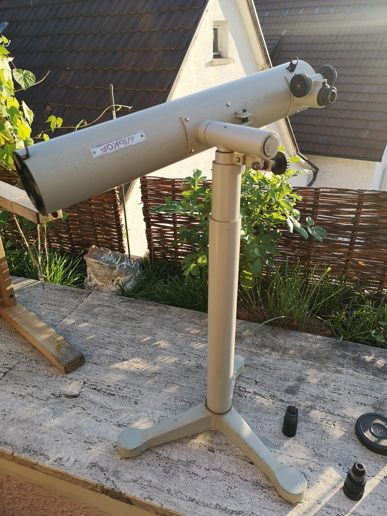 Erster Eindruck: schnell das Negative abarbeiten: das mitgelieferte Okular taugt nix. Der Peilsucher ist gewöhnungsbedürftig, aber später klappte es dann. Ein kleiner Sucher (und wenn es so ein achromatischer 5x24er sein könnte) wäre echt ein Gewinn. So. Kleinigkeiten, die den ansonsten sehr positiven Eindruck nur wenig schmälerten. Zunächste die Optik: Wie sagen die englischsparchlichen: "outstanding": einfach gut. Sternabbildungen wie im Refraktor (bis auf den vielleicht etwas dicken Beugungsring bei Izar). Auch die Planetenabbildung: ganz was Feines ( in den Mikroskopokularen). Macht einfach Spass. Das Teleskop ist zudem ein wunderbares "Grab&Go-Gerät. Richtig pfiffig - ich erwähnte es schon: die teilschraubbare Säule. Was aber noch zu tun ist: das OAZ-24.5er Problem ist zu lösen und irgendwie muss da doch noch ein kleiner Sucher ran. Natürlich beides nur so, dass es alles rückbaubar ist. Ohne Spuren.