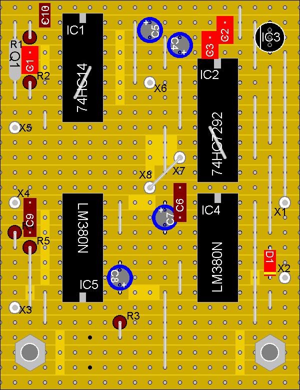 Als Platine dient eine Lochstreifenplatine mit den Abmessungen 50x66mm und Raster 2,5mm. Der fertige Frequenzwandler kann anstelle der LED-Platine des TAL-Teleskopes eingebaut werden, somit wird nur eine Batterie oder ein Akku ans TAL angeschlossen. Der Kabelsalat wird somit minimiert.
