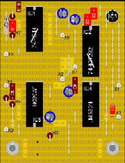 Zuerst werden die beiden Fassungen für IC1 und IC2 eingelötet. Ungeübten sei gesagt, wer das schafft packt den Rest auch! Dann folgen die anderen kleineren Bauelemente wie Kondensatoren und Widerstände. Achtung! Auf richtige Polarität der Tantal- u. Elektrolytkondensatoren achten. Jetzt noch schnell IC3, Diode und den Quarz eingelötet, dann können als vorletzte Bauteile IC4 und IC5 eingelötet werden. Diese ICs müssen deshalb eingelötet werden, weil sie einen Teil ihrer Verlustwärme über die Massepins an die Leiterbahnen abgeben.
