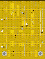 Zuerst wird die Platine abgeschnitten. 26 Lochstreifen mit einer Länge von 19 Rastern werden benötigt. Die Platine wird mit der Kupferseite nach oben auf den Tisch gelegt, dann werden alle zu trennenden Streifenabschnitte mit z.B. einem Edding-Faserstift markiert. Als Vorlage dient hierzu Bild 3. Die hellen Stellen markieren hier die ausgetrennten Stellen in den Leiterbahnen.