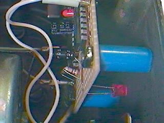 Noch sind IC1 und IC2 nicht in den Fassungen, es wird zum ersten Mal 12V Spannung an die Schaltung gelegt.Plus auf Lötpin X1 und Minus auf Lötpin X2. Nun muß, gegen Pin 2 gemessen, am Pin 3 von IC3 eine Spannung von 5V anliegen. Es kann auch schon die LED zu Testzwecken eingelötet werden, am besten aber auf der Bauteiloberseite. Dabei aber nicht die Pins abschneiden, da diese LED später vor dem Einbau ins Motorgehäuse des TALs auf die Lötseite gelötet werden muß, die genaue Drahtlänge (ca.2cm) ist von den Abstandhülsen abhängig die zur Platinenbefestigung verwendet werden.
