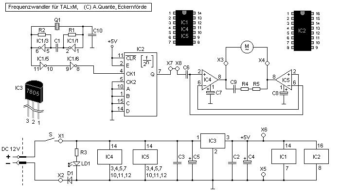 Als Taktgeber dient ein Quarz (Q1) in Oszillatorschaltung mit IC1, das als Ausgang ein 5V Rechtecksignal liefert. IC2 ist ein programmierbarer Frequenzteiler. Das von IC1 kommende Signal wird vielfach geteilt, bis am Ausgang von IC2 ein 5V Rechtecksignal mit einer Amplitudendauer von 20ms bzw. 50Hz heraus kommt. Das 50Hz Signal treibt einen Gegentaktverstärker, der aus IC4 und IC5 aufgebaut ist. Die Ausgänge der Gegentaktverstärker speisen direkt den Synchronmotor des TALs.