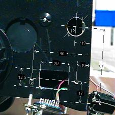 Die Ausschnitte für den Schalter 3 und die Gerätesteckdose werden am besten nach den Maßen auf Bild 8 vorgenommen. Für den Schalter S3 wird ein 12mm Loch gebort. Für die Steckdose werden zwei 3 - 4mm große Löcher (je nach Schraube) zur Befestigung gebohrt und ein Ausschnitt für den Anschlussteil. Für diesen Ausschnitt habe ich ringsherum mit einem 3mm Bohrer einen Öffnung ausgebohrt, dann alles mit einer kleinen Feile geglättet. Da es sich um ein Alu-Gehäuse handelt, lässt sich es sich sehr einfach bearbeiten. Zweimal bin ich aber mit der Feile abgerutsch, wie die Spuren auf dem Gehäuse zeigen ;-)