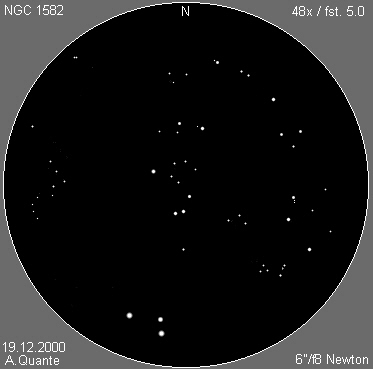 Von NGC1664 wird das Teleskop nun 3,5° in Richtung Westen geschwenkt. Im Sucher erscheint unübersehbar der große Sternhaufen NGC 1582. Im 25mm TAL-Plössl macht sich dieser Haufen fast okularfüllend. Ein schöner Sternhaufen, viele verschieden helle Sterne. Im Westen bilden einige Sterne einen Bogen. Etwas östlich sind ein paar sehr schwache Sternlein auszumachen, ob die zum Haufen gehören? Dieser Sternhaufen inspiriert mich ebenfalls dazu eine Zeichnung anzufertigen. Nun geht es schon etwas besser. Trotz vieler Sterne gelingt es mir diese recht zügig aufs Papier zu bringen. Etwas schwierig ist es die Größe der Sterne zu vermerken. Bei dieser Zeichnung mache ich es erstmals so, dass jeder Stern egal wie hell als einfacher Punkt verzeichnet wird. Die Grenzgröße des Sterns wird mit einem der Helligkeit entsprechend langen Fähnchen gekennzeichnet. Ganz kleine, gerade um Sichtbarkeit ringende Sterne werden nur als Punkt vermerkt.