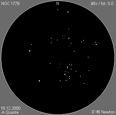 Nun stelle ich NGC1778 ein. Ein kleiner Sternhaufen ca.4° nordwestlich von M38. NGC1778 ist eine interessante Konstellation. Einige Sterne in südlichen Teil bilden einen gewundenen Schwanz, der in Richtung eines hellen etwas östlich stehenden Sterns zeigt. Bis auf diesen ca. 9 mag hellen Stern sind fast nur gleich große, etwa 11mag helle Stern zu erkennen. Nur ein paar wenige schwache Nadelstiche kann ich bei längeren Hinschauen erkennen. Jetzt versuche ich das Unmögliche! Bewaffnet mit gespitzten Bleistift und Zeichenplatte sowie „unterstützt" von einem Bügelstuhl fange ich an meine erste Astrozeichnung anzufertigen. Zwar habe ich schon ein paar Mal kleine zeichnerische Notizen angefertigt, diese aber nie als Zeichungen fertig gestellt. Vor lauter Konzentration merke ich gar nicht das ich dabei schwer atme. Völlig selbstvergessen sitze ich nun da und peile - nehme das Auge vom Okular - will Punkte auf das Papier machen: „Moment wie war das nochmal.." nochmal schauen. Es dauert lange, sehr lange bis ich mich dafür entscheiden kann, dass alle Sterne im Gesichtsfeld des 25er Plössls nun auch auf dem Papier vermerkt sind. Schnell noch Nordrichtung vermerkt - durchatmen.