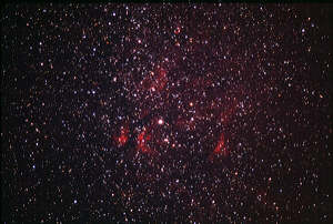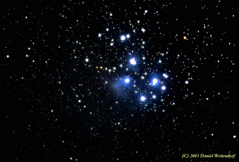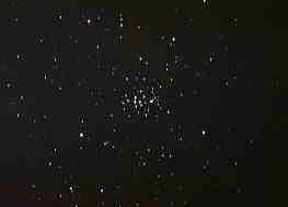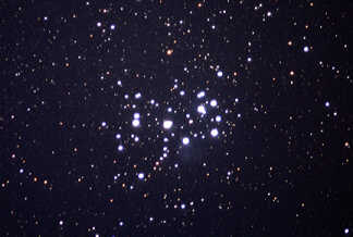 Pleijaden (Bildauschnitt) Objektiv: Tokina 3.5/220mm, Blende 4 Kamera: Edixa mat-reflex b Film: Dia, Kodak Elitechrome 200, selbst entwickelt Belichtungszeit: ca. 13 Minuten Ort: Aschberg (Ascheffel) Datum: 17.8.2001 Bildnachbearbeitung: Uwe Müller Bemerkung: Die Kamera war Kallepack auf dem TAL2M montiert. Nachgeführt wurde mit EZB und 15mm Kellner mit Fadenkreuz.