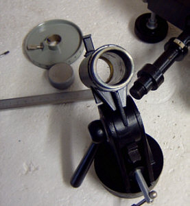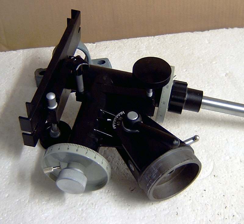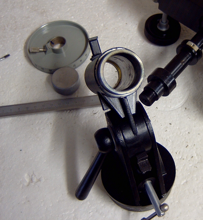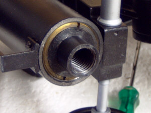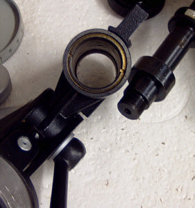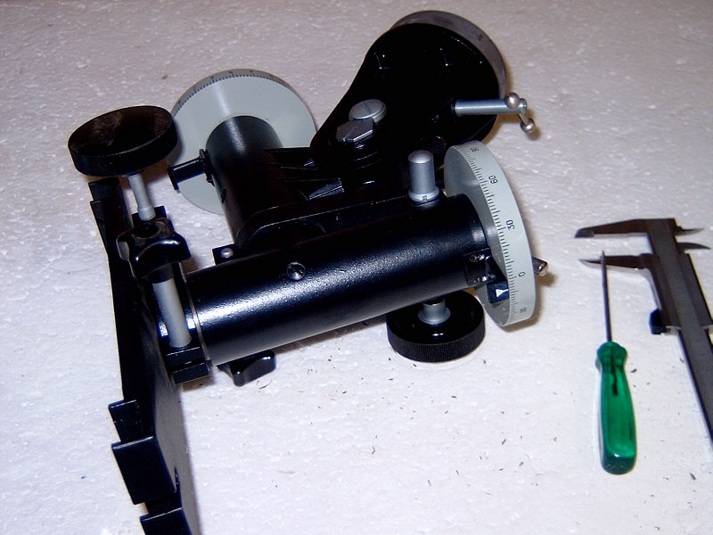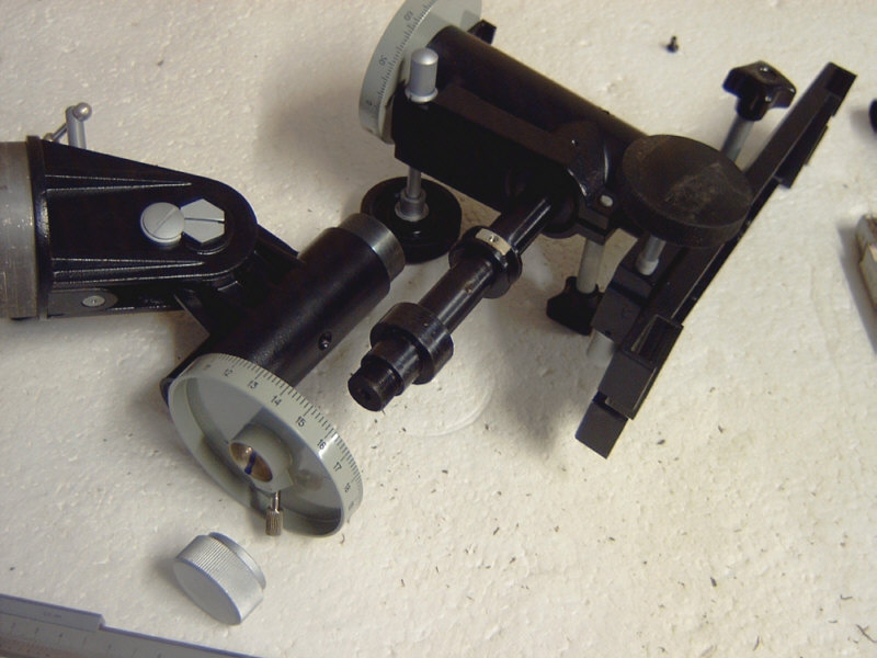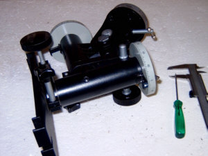 Ich habe übrigens mal nachgemessen - die Gleitbuchsen haben einen Innendurchmesser von 30 mm und einen Aussendurchmesser von 36 mm. Der Gesamtdurchmesser der Achsgehäuse beträgt 42 mm. Das gleiche Spiel wie bei der Polachse wiederholt sich bei der Deklinationsachse. Hier die Bilder : Ein "unkonventionelles" Detail am Rande. Beim Vermessen der Achsen habe ich festgestellt, dass die Pol-Achse einen Kerndurchmesser von 17,8 mm - die Deklinationsachse jedoch einen von 18,0 mm hat. Zumindest aber Vollmaterial - soviel zur russischen, unkomplizierten Fertigungsphilosophie ! Das letzte Bild zeigt noch einmal die Messing-Buchse am unteren Ende der Deklinationsachse, also dort, wo die Gegengewichtsstange eingeschraubt wird. Wie man sieht ist das zerlegen und ggf. die Wartung einer TAL-1 Montierung also wirklich ein Kinderspiel, welches in wenigen Minuten erledigt ist. Wie gesagt, hatte ich erst an ein Montierungstuning gedacht. Mir schwebten hier Kugellager vor - allerdings scheinen mir die Relation von Arbeitsaufwand und evtl. zu erwartendem Nutzen, doch eher unattraktiv und daher bleibt die Montierung so wie sie ist : einfach, aber grundsolide und stabil !
