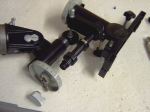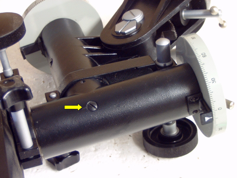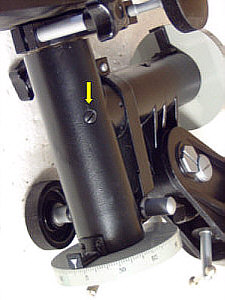Zum Teil aus reiner Neugier, zum Teil aber auch mit dem Hintergedanken, meine TAL-1 Montierung ( ohne Motor ) etwas zu tunen oder generell einmal zu warten, beschloss ich die Montierung zu zerlegen. Was dabei herauskam, habe ich hier in einem kleinen Bildbericht beschrieben. Grundsätzlich ist die TAL-1 eine grundsolide Montierung, die recht einfach aufgebaut ist. Vielleicht ist sie jedoch gerade deshalb so robust und zuverlässig. Ich betreibe auf dieser Montierung zur Zeit noch einen 90/1000 mm Fraunhofer Refraktor von Meade, den Explorer 395. Zwar hat das Gerät eine bescheidene Öffnung, belastet eine Montierung aber schon mit einem ordentlichen Hebel. Eine EQ-3 war damit schon grenzwertig belastet ! Auf der TAL-1 Montierung sitzt der FH bombenfest und zitterfrei. Wie zerlegt man nun die Montierung ? Im Grunde ist die Arbeit für beide Achsen völlig identisch und in ein paar Minuten erledigt. Wegen des einfachen Konstruktionsprinzip muss man sich nur mit wenigen Teilen herumschlagen - anders als bei China-Montierungen, die aus 10000 Einzelteilen bestehen und doch nicht immer stabiler sind... Um die Achsen aus dem Achsgehäuse ziehen zu können, müssen zunächst die Feststellschrauben und Teilkreise abgezogen werden. Dann löst man die im linken Bild markierte Schraube - Vorsicht : die Schraube ist sehr klein und sehr kurz - nicht verlieren. Schwups ! Schon kann man die Pol-Achse aus dem Gehäuse ziehen - siehe Bild rechts. Dabei taucht die erste Überraschung auf : ich dachte bisher immer, dass die Achsen kugelgelagert seien. Dies ist aber nicht der Fall. Vielmehr verbaut TAL hier Gleitlager bzw. Gleitbuchsen. Das muss aber kein Nachteil sein ! Gerade bei kleinen Montierungen und entsprechend kleineren Achsdurchmessern sind Gleitlager oft präziser als gleich grosse Kugellager. In der Tat gibt es bei dieser Montierung auch überhaupt nichts an den Laufeigenschaften der Achsen zu bemängeln. Sie drehen sich spiel- und ruckelfrei, so wie es sein soll