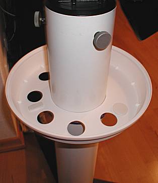 An die Unterseite des Tellers habe ich im 120-Grad-Abstand drei weiß lackierte Eisenwinkel (ca. 4 cm) angeschraubt.[Foto] WICHTIG: um Schaden am Okularmaterial zu vermeiden, Schraubenköpfe auf der Oberseite der Ablage "verkleiden", oder aber z.B. Schrauben mit flachem Kunststoffkopf verwenden. Beim Anschrauben der Winkel 1-2 mm berücksichtigen, um die an der Säule anliegenden Schenkel vorher mit Filz zu bekleben.