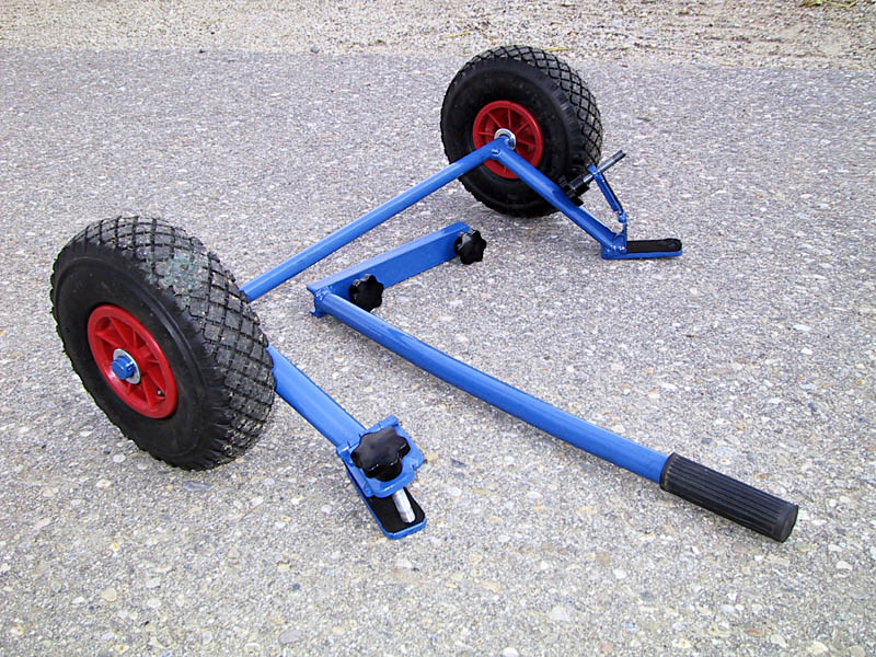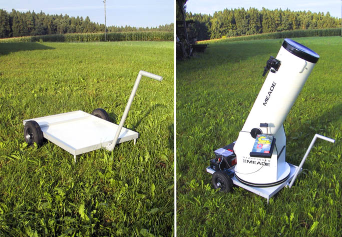 Schon als ich mir das TAL2M im Dezember 1999 anschaffte, reifte in mir der Wunsch, das Rausschleppen und Aufbauen dieses massiven Teleskops einfacher zu gestalten. Ich muß zugeben, daß die Anzahl der Beobachtungsnächte nicht nur vom Wetter abhängt, sondern auch davon, wie kompliziert es ist, das Teleskop betriebsbereit zu machen. Für den Beobachtungsspaß und für die Fotografie waren aber erst andere Projekte wichtiger. So baute ich erstmal die Motorfokussierung, EZB 1-3, Okularhalterung, Heizmanschetten gegen Tau von Sucher, Okularen und Objektiven, es gibt ja an einem Teleskop immer was zu basteln. Durch einen günstigen Umstand kam ich dann zu einem 10"Dobson. Das TAL kam dann nur noch sporadisch zum Einsatz, in erster Linie nur dann wenn's um Fotografie ging. Ein fahrbarer Untersatz war da nicht mehr so notwendig. Der Dobson ist mit 28kg sehr schwer gebaut, alsbald schweißte ich aus ein paar Eisenteilen und alten Rädern einen Karren zusammen, wo der 10 Zöller plaziert wurde und in der Regel auch beim Beobachten drauf bleibt. Den Henkel zum Fahren kann man leicht abnehmen.