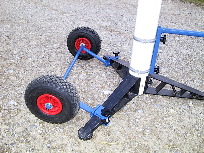 Im stehenden Zustand liegen die Räder nicht am Boden an, erst beim Hochheben steht das Teleskop auf den Rädern. Im Prinzip könnte man das TALobil beim Beobachten dranlassen, würde es aber nicht empfehlen. Die Stolpergefahr ist doch enorm.